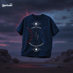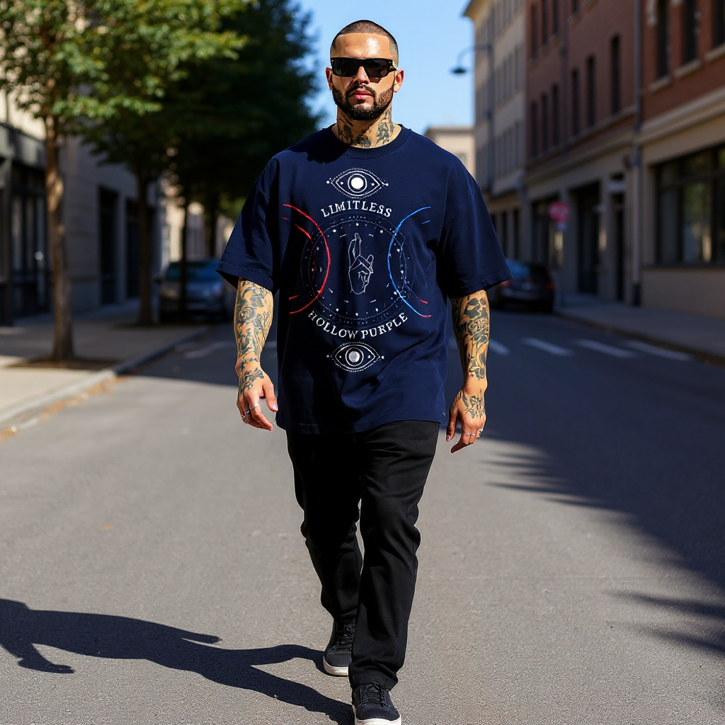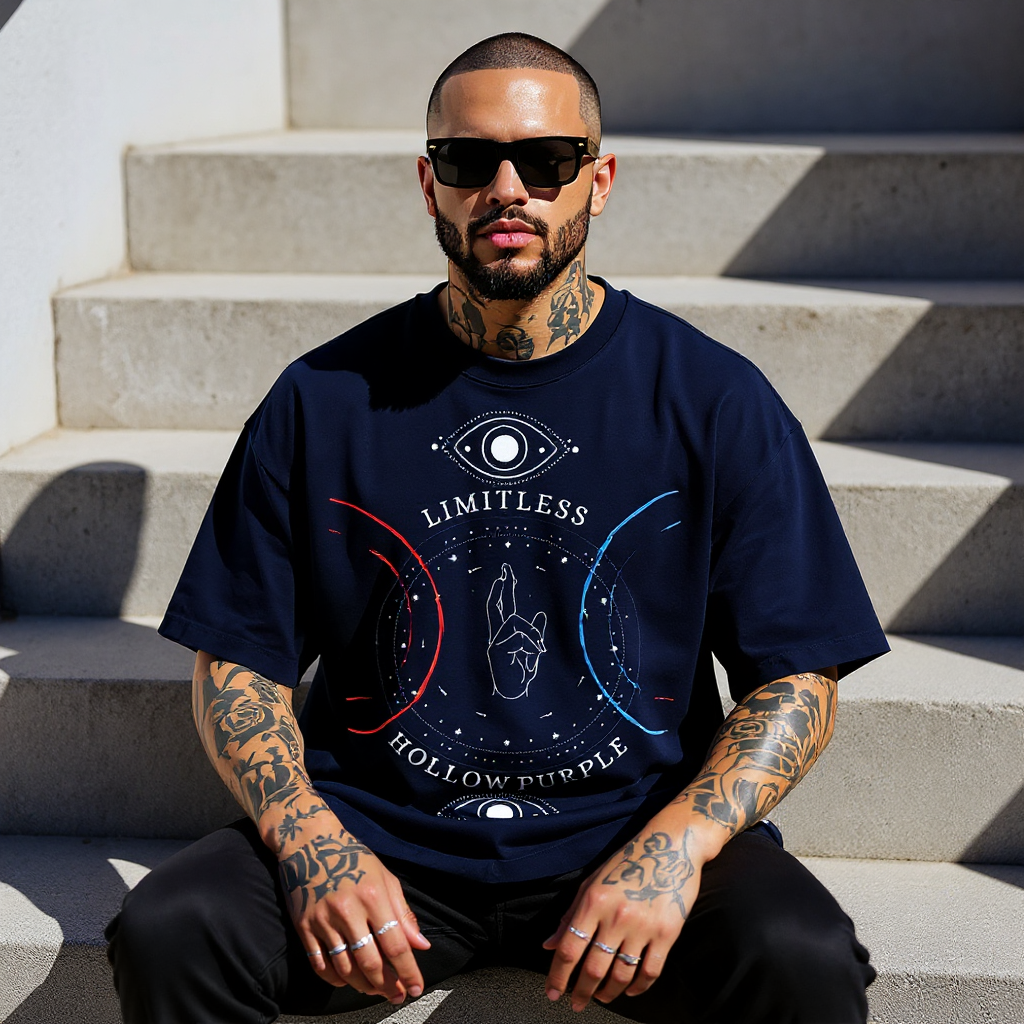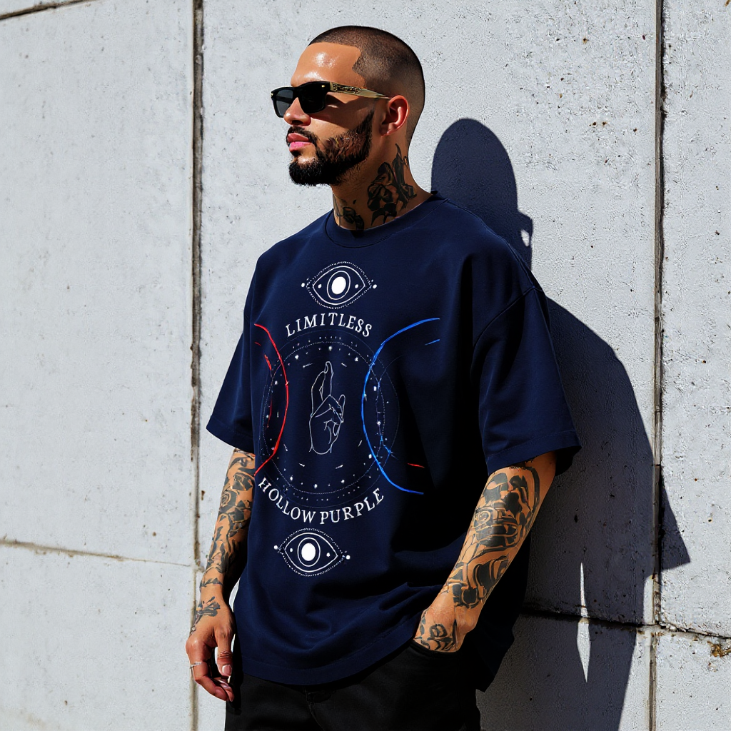 Enter the realm of contrast and cosmic energy with the Astral Duality – Hollow Spectrum Tee. This oversized navy blue t-shirt showcases a powerful fusion of red and blue spectral curves, all-seeing eye symbols, and a hand gesture at the center — representing focus, power, and inner control. The “Hollow Spectrum” concept reflects balance between limitless potential and the void, making this piece more than just apparel — it’s a statement.