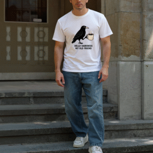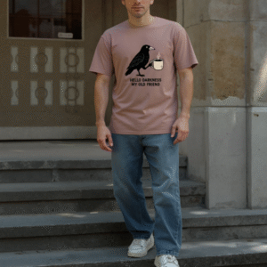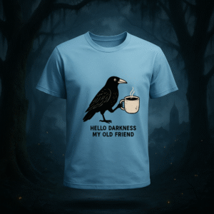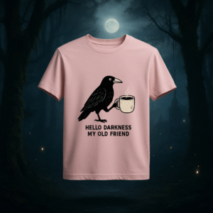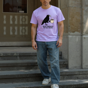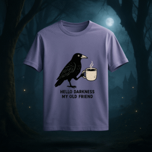 Start your mornings with a dose of humor and a splash of caffeine-loving sarcasm. The Caffeinated Crow Tee – “Hello Darkness” Edition features a quirky black crow clutching a steaming cup of coffee, accompanied by the witty phrase: “Hello Darkness, My Old Friend.” Set against a trendy lavender backdrop, it’s a perfect tee for coffee addicts, night owls, or anyone who greets the day reluctantly.