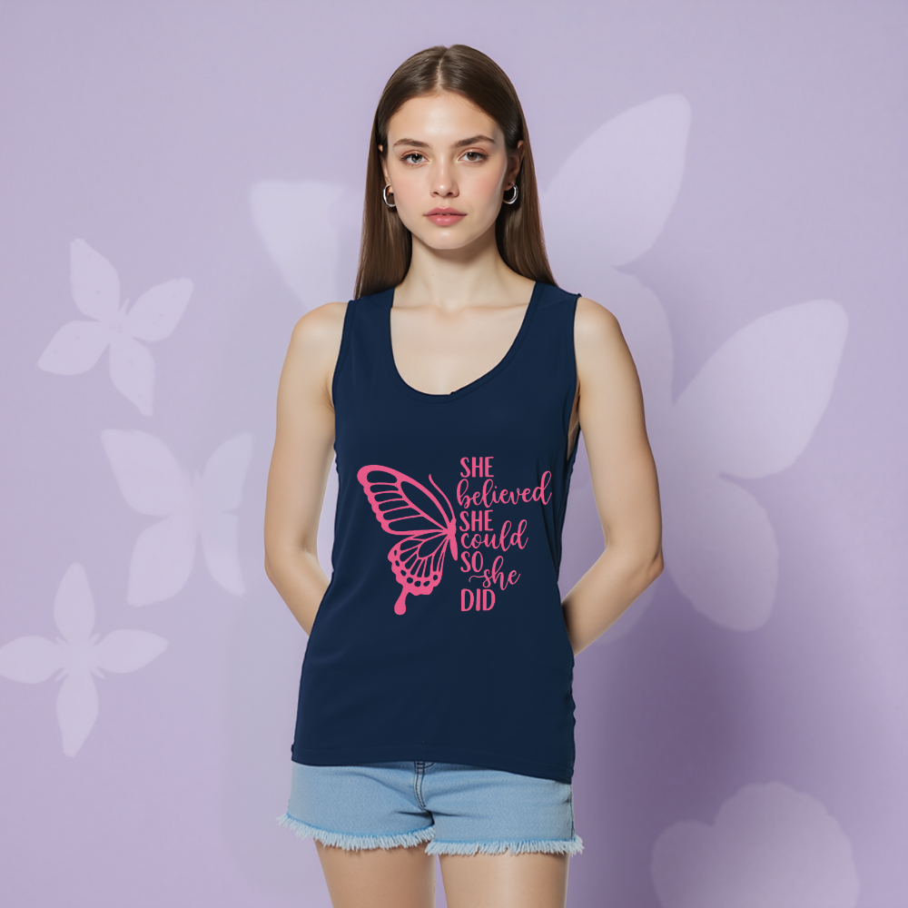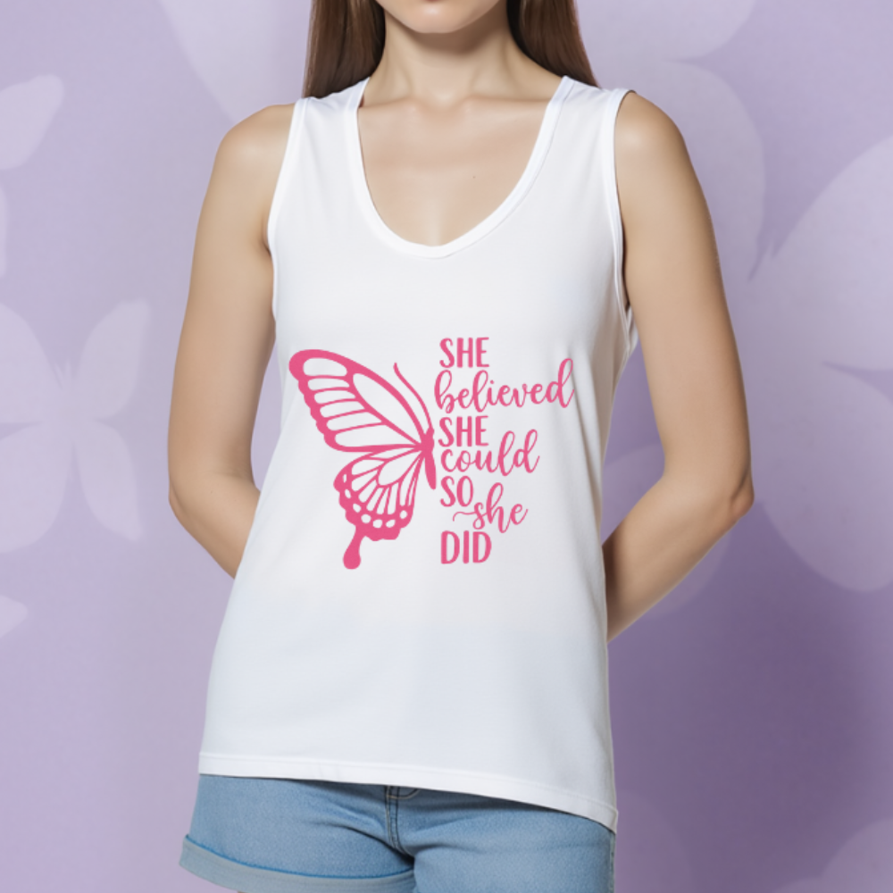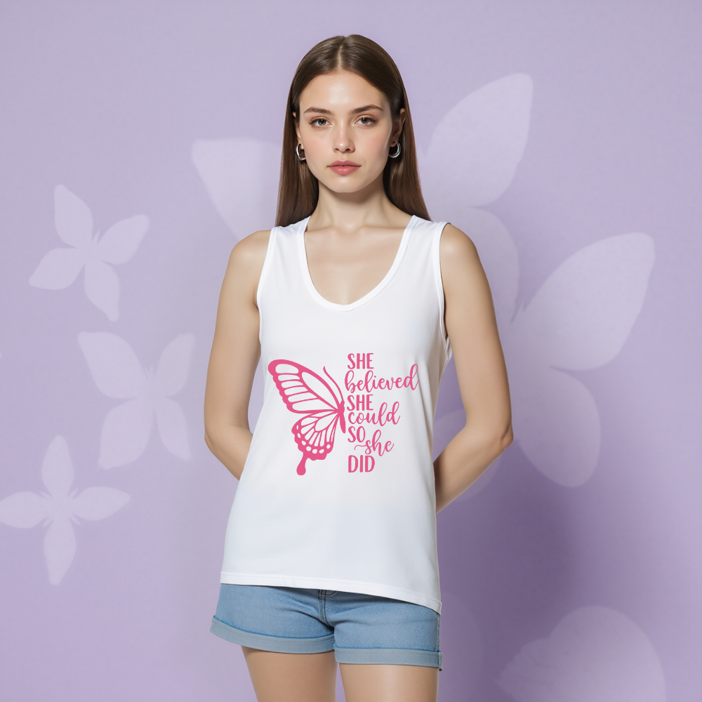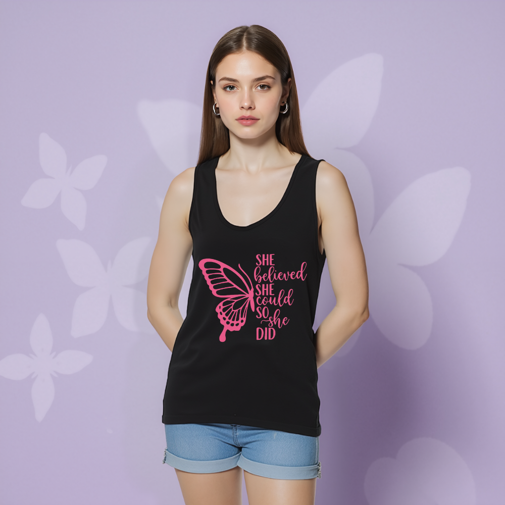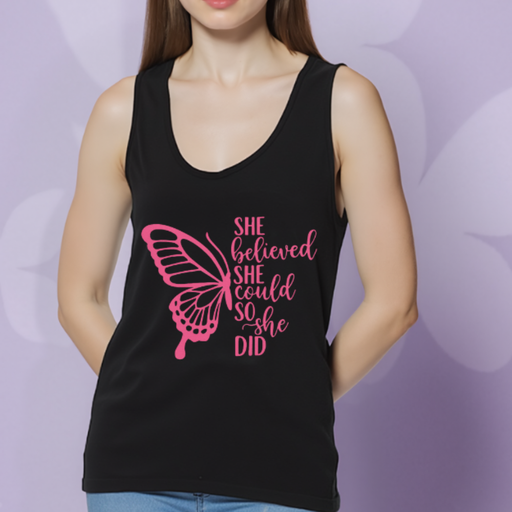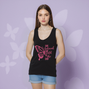 Unleash your inner strength with the EmpowHer – Believe & Bloom Tank, a bold tribute to feminine resilience and transformation. Featuring a vibrant butterfly silhouette and the empowering mantra “She believed she could, so she did,” this tank radiates confidence, growth, and unstoppable energy.