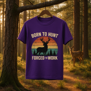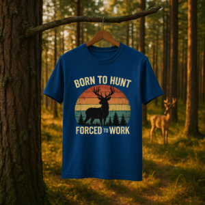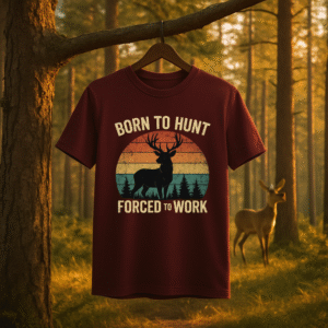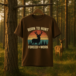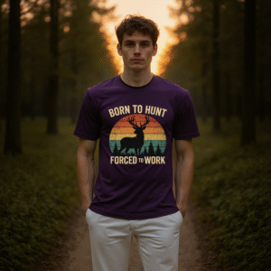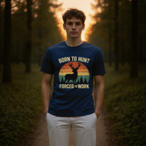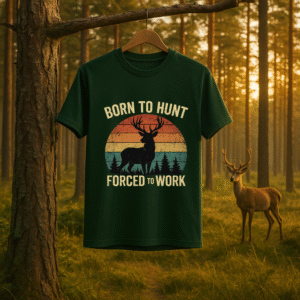 Unleash your primal side with the HuntLegacy – The Outland Drop. Featuring a rugged vintage-style print of a majestic stag silhouetted against a retro sunburst and forest backdrop, this tee boldly declares: “Born to Hunt, Forced to Work.” It’s a perfect fusion of outdoor grit and everyday hustle.