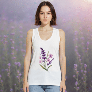 Step into soft elegance with the Laventia Bloom Grace Tank — a delicate fusion of floral artistry and feminine charm. Featuring a stunning watercolor-inspired bouquet of lavender and wild pink blooms, this design evokes calm, beauty, and nature’s quiet strength.
