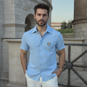 Crafted from luxury-grade cotton with a soft yet structured finish, this shirt ensures comfort, breathability, and durability. The highlight is the embroidered crest emblem on the chest — a mark of honor and sophistication that adds heritage flair to a modern design.