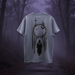 The Phantom Path Oversized Tee captures the silence of the woods and the power of presence. Featuring a haunting monochrome back graphic of a lone figure walking through a dead forest under a phantom moon — it’s mystery, solitude, and rebellion stitched into heavyweight cotton.
