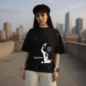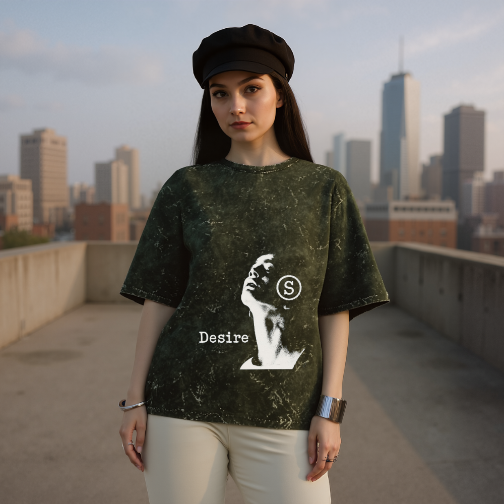 The Starfreak Desire Drop is a visual representation of craving — the upward gaze that dares to dream beyond limits. Crafted in acid-washed black with a hauntingly elegant monochrome portrait, this piece blends grunge art with street soul.