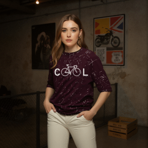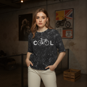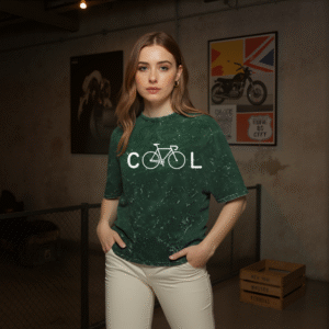 With an oversized silhouette and bold bicycle-based “COOL” typography, this acid-washed black piece is for those who ride their own rhythm — chilled, confident, and unapologetically original.