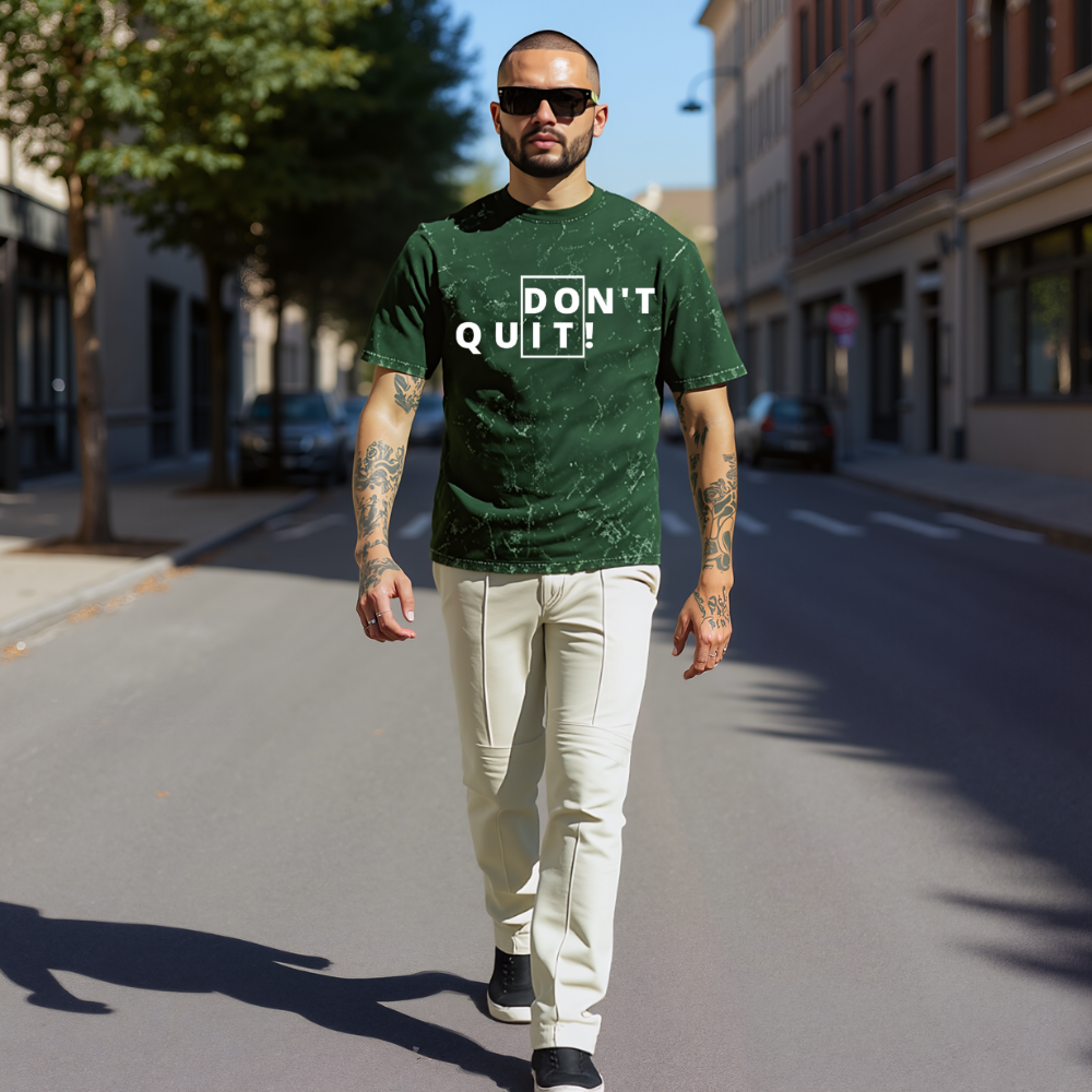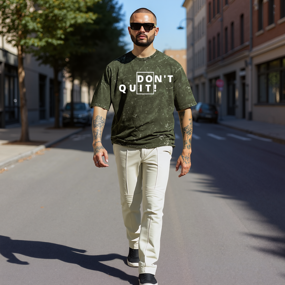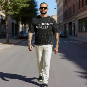 Designed with a rugged acid wash finish, this black oversized t-shirt features the striking “DON’T QUIT” split-box print, igniting power with every step.